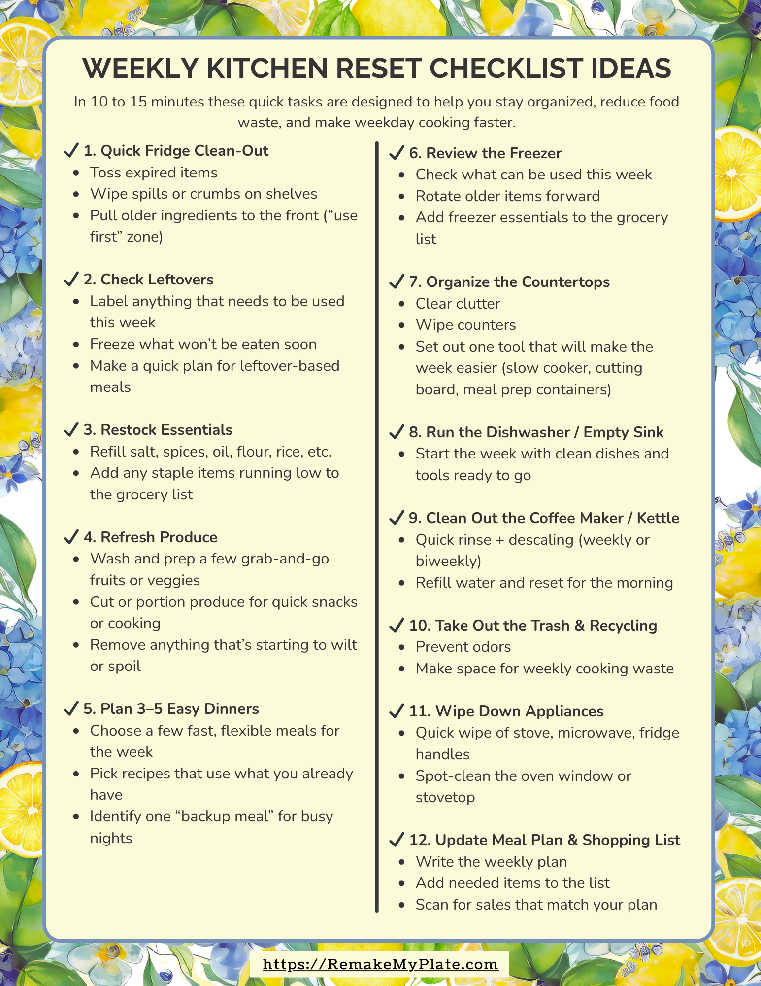 A kitchen reset is a simple, weekly routine that helps you start the week with a clean, organized, and ready-to-use kitchen. Instead of deep cleaning or complicated prep, a reset focuses on a few small, high-impact tasks that make everyday cooking faster and less stressful.